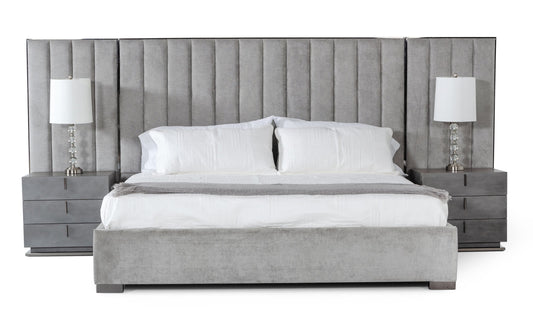 Nova Domus Maranello - Modern Grey Fabric Bed w/ Two Nightstands