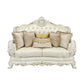 Dimensions by Inches: Length x Width x Height 70x42x54H Description: Seat Construction: Full Foam Wooden Inner Frame Tight Back & Loose Seat Cushion Nailhead Trim Acrylic Diamond Tufted Foam Density: D26 5 Pillows Included Silver Trim Color: White Pu & Antique White Finish Materials: Wood, Resin, Upholstery