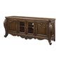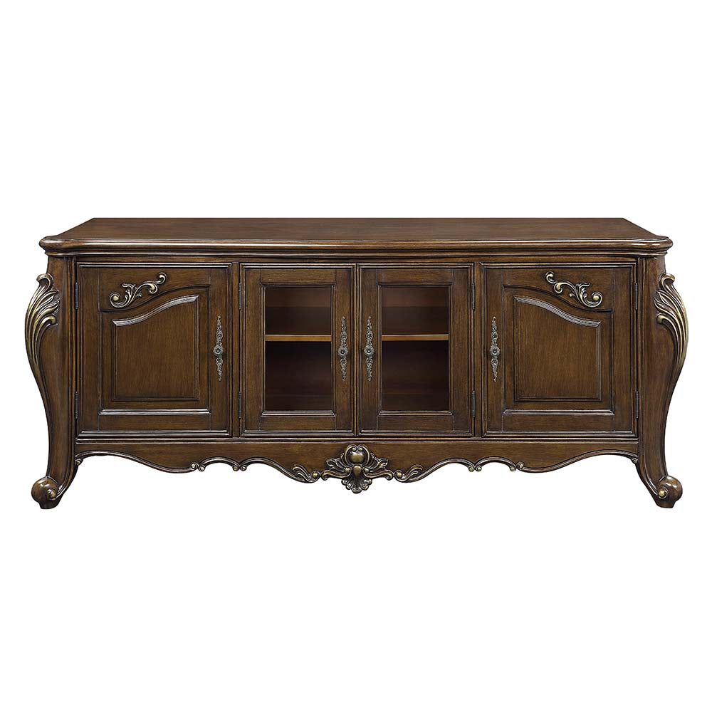 Dimensions by Inches: Length x Width x Height 77x24x31H Description: Touch Light Tempered Glass Doors & Shelves Cord Management Included Max TV Recommanded: 68" Color: Dark Walnut Finish Materials: Wood, Composite Wood, Resin, Veneer, Tempered Glass