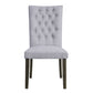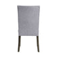 Dimensions by Inches: Length x Width x Height 21x25x41H Description: Armless Parson Chair (High Backrest) Stationary Seat: Standard Dining Height Padded SEAT & BACK: Gray Fabric Cushion (Gray Multi-Tone Shades) Square Backrest: Button Tufted (Inside) Wood Tapered Leg: Gray Oak Finish Color: Gray Linen & Gray Oak Finish Materials: Wood, Upholstered (Seat)