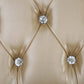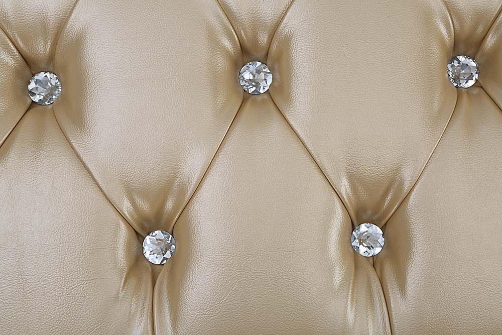 Dimensions by Inches: Length x Width x Height 66x23x24H Description: Padded Seat Cushion Acrylic Diamond Tufted Foam Density: D25 Color: Antique Gold Finish Materials: Composite Wood, Resin, Upholstery