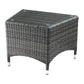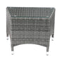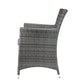 Dimensions by Inches: Length x Width x Height 24x24x35H Description: Assambled, 3Pc Pack: 2 Arm Chairs & Side Table NO Storage Trapezium Table w/Glass Top Arm Chairs (High Backrest) Stationary Seat: Standard Dining Height Padded Seat: Gray Fabric, Reversible Cushion, Water Resistant (Removable Cover-Zipper), Cushion Size: 2 Inches Thick (5cm) Armrest: Thin, Slightly Flared Metal Round Leg: Aluminum Powder Coated CONSTRUCTION: Table Top: 5mm Clear Tempered Glass (NOT Beveled), Gray Finish Flat All-Weather Wicker (8 x 1.3mm) Chair & Table Frame: Gray Finish, Flat All-Weather Wicker (8 x 1.3mm) & Aluminum Powder Coated (Chair 25/16 x 1.2mm, Table 24/22 x 1.2mm) Color: Gray Fabric & Gray Wicker Materials: Resin Wicker, Glass, Aluminum, Upholstered (Seat)