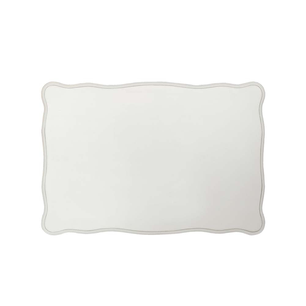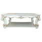 Dimensions by Inches: Length x Width x Height 58x40x22H Description: KD, Rectangular Table w/Scrolled Leg and Bottom Shelf Top Apron: Scrolled Decor Trim Color: Antique Pearl Finish Materials: Wood, Veneer, Resin, Composite Wood